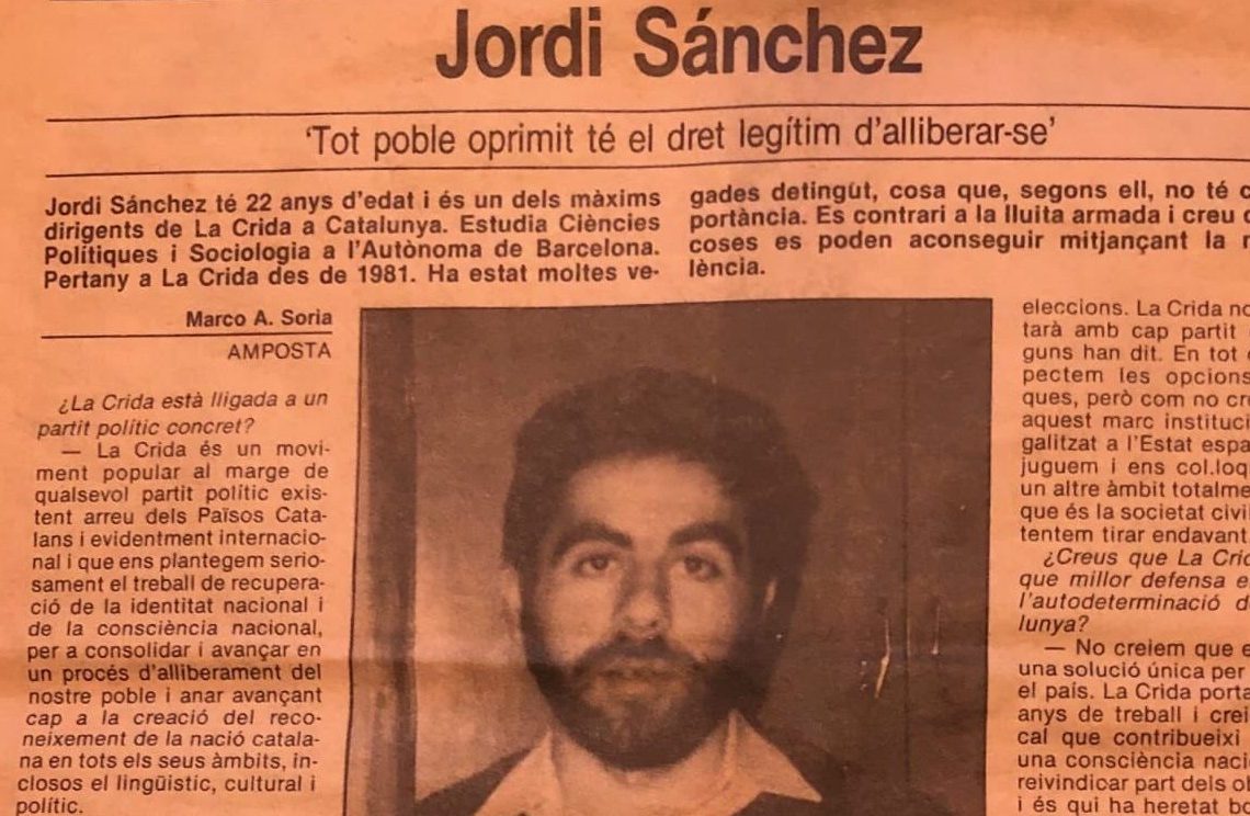 Jordi Sànchez tenia 22 anys i era un dels màxims dirigents de la Crida quan el periodista ebrenc Marco A. Soria, que va morir fa més de 10 anys, va entrevistar-lo des d’Amposta per a les pàgines del Diari de Tarragona. “Tot poble oprimit té el dret legítim d’alliberar-se”, afirma Sànchez al titular de l’entrevista, que fa uns dies difonia a través de les xarxes la periodista i advocada Beatriz Talegón. Devia ser el 1987, però al retall de l’entrevista no es veu la data de publicació. Sànchez, que aleshores estava estudiant Ciències Polítiques i Sociologia a la UAB, pertanyia a la Crida des del 1981, i ja havia estat unes quantes vegades a la presó pel seu activisme polític; “cosa que, segons ell, no té cap importància”, destacava Soria a l’entradeta de la peça, just abans de remarcar que l’entrevistat era “contrari a la lluita armada” i que pensava que les coses “es poden aconseguir mitjançant la no violència”.